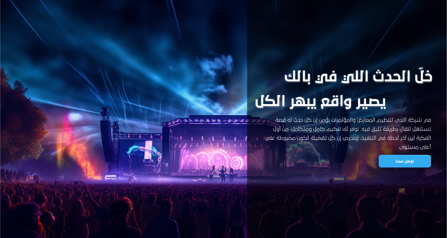 نُحوّل الأفكار إلى لحظات لا تُنسى! سواء كانت مهرجانات عامة، حفلات وطنية، مناسبات مؤسسية أو احتفالات خاصة، نوفر لك كل ما تحتاجه لتنظيم حدث فريد ومُميز.